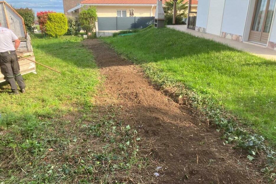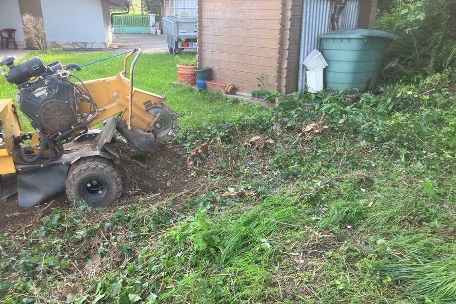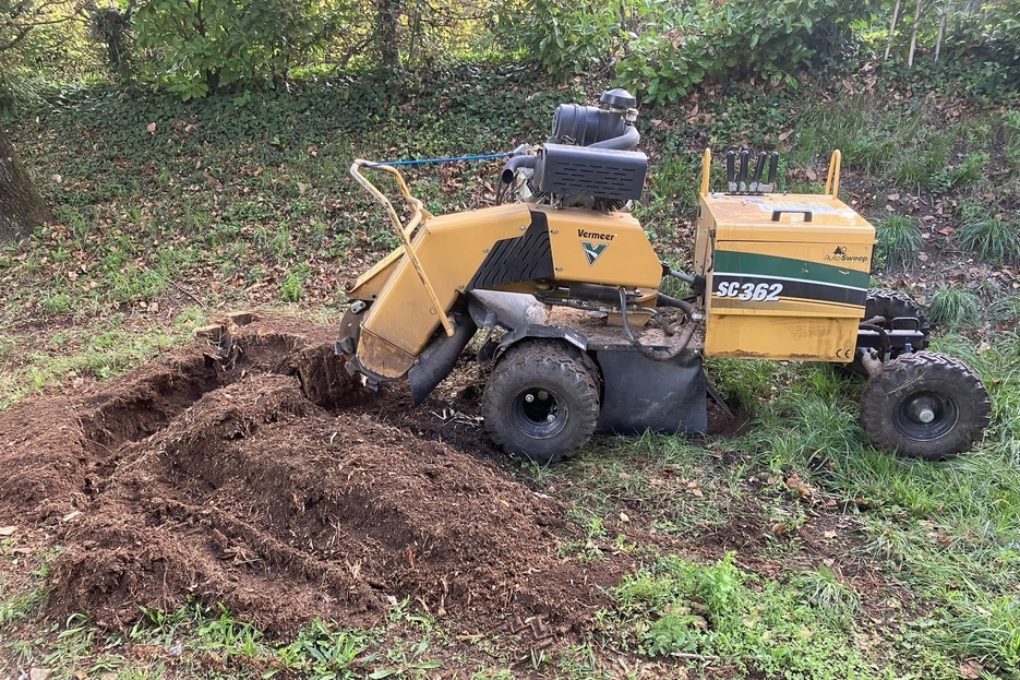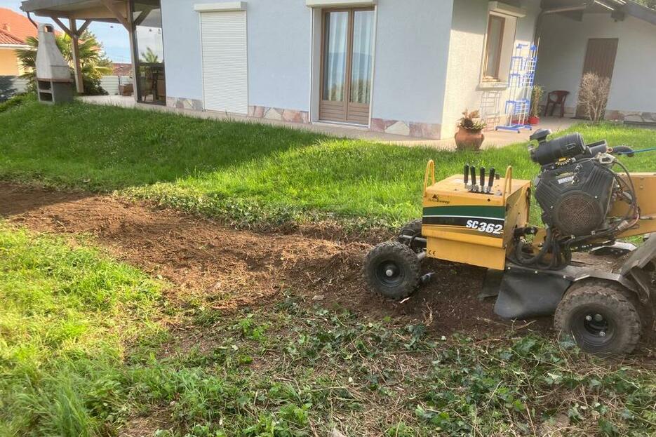 Le rognage permet d'éliminer la souche ainsi que les principales racines superficielles sur une profondeur de 30 cm. Grâce à une machine spéciale, l'entreprise peut passer par des portails de jardin étroits de 80 à 100 cm de large pour transformer la souche en sciure.