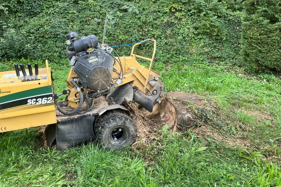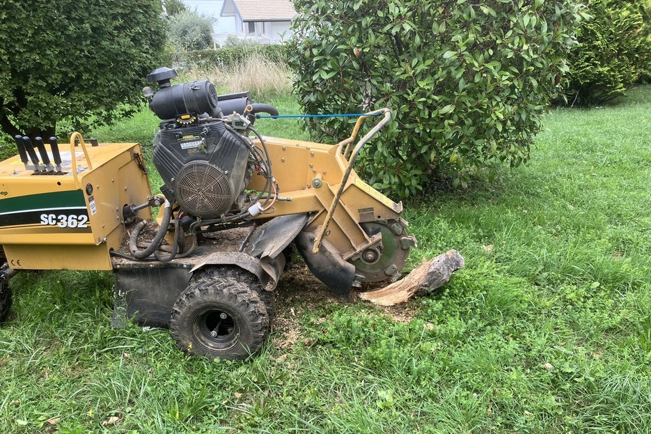 Le rognage permet d'éliminer la souche ainsi que les principales racines superficielles sur une profondeur de 30 cm. Grâce à une machine spéciale, l'entreprise peut passer par des portails de jardin étroits de 80 à 100 cm de large pour transformer la souche en sciure.